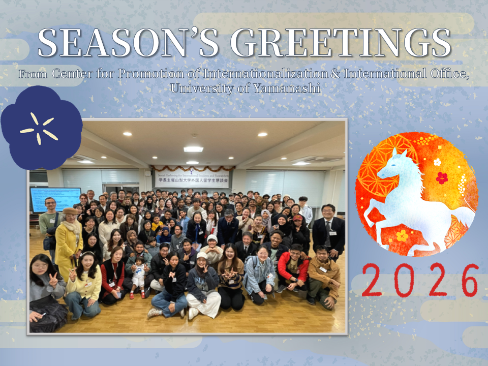 国際化推進センター・グローバル推進課(旧 国際交流センター・国際部)から、ホリデーシーズンのご挨拶を申し上げます。 国際化推進センターでは、卒業生の皆さんとのネットワークを大切にしていきたいと考えています。 最新の山梨大学の情報をこちらからぜひご覧ください。 ・大学ホームページ:https://www.yamanashi.ac.jp/ ・広報誌「Vine」: https://www.yamanashi.ac.jp/wp-content/uploads/2025/08/Vol.47-3.pdf ・国際化推進センター・グローバル推進課:https://www.ciee.yamanashi.ac.jp/ 2026年もみなさんにとって素晴らしい年となりますように! みなさんのご健勝とご活躍を、心よりお祈り申し上げます。 Dear Alumni, Season's Greetings from Center for Promotion of Internationalization & International Office (former Center for International Education and Exchange and Office of International Affairs), University of Yamanashi! We value the connection with our alumni. Here's our latest public relations magazine, "Vine". Please check out recent University of Yamanashi! ・University’ website: https://www.yamanashi.ac.jp/en/ ・Vine: https://www.yamanashi.ac.jp/wp-content/uploads/2025/08/Vol.47-3.pdf ・Center for Promotion of Internationalization’ website: https://www.ciee.yamanashi.ac.jp/en/ We wish you a very happy new year!