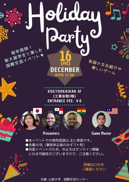 A social gathering for international students and researchers was held on Dec 4th 2018 at Kofu Campus. About 170 people, including community representative, international students and researchers together with their family members, and university staff took part in the event this year.