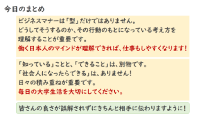 また、チームワークで働く上で重要なポイントとして、時間厳守、ホウレンソウ(報告・連絡・相談)、配慮のある話し方について教わりました。