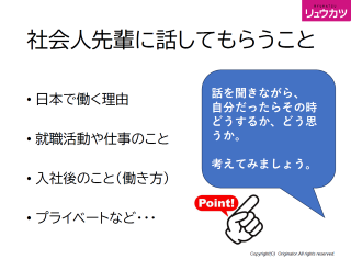 日本企業の雰囲気や自分らしく働くための工夫や心がけなどについて、ご自身の経験を分かりやすく話してくださり、参加した留学生からは「英語をもっと勉強しなければならないと思った」という感想や、「自分で調べても分からないことがあったら、誰にどのように聞いたらいいのか」という質問も出ました。
